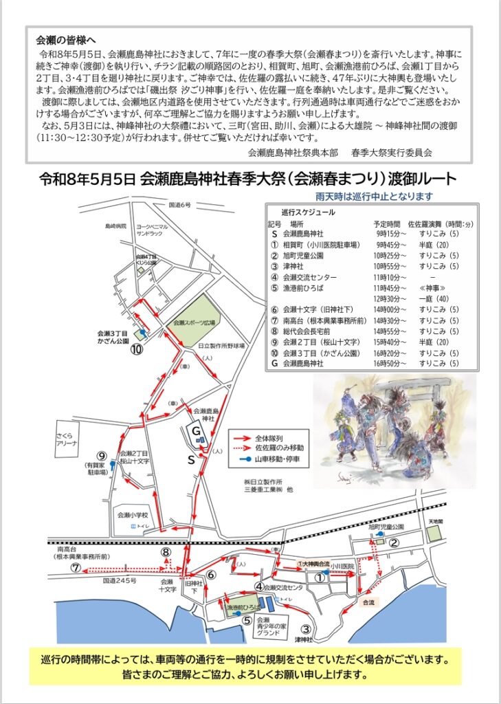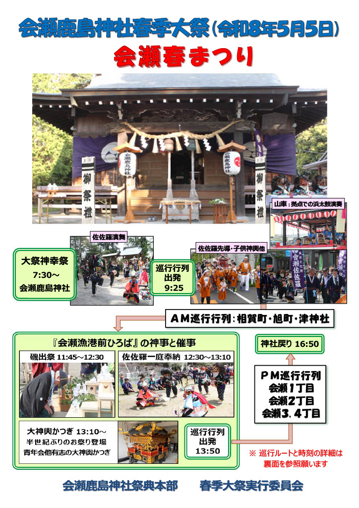 令和8年春季大祭 2026.03.11 2026.03.07 5月5日会瀬鹿島神社春季大祭を開催予定です。 (5月5日午前6時に開催を提示します) 令和8年5月5日、会瀬鹿島神社において7年に一度の春季大祭(会瀬春まつり)を斎行いたします。 皆様のご協力をお願いいたします。詳細はチラシを参照してください。