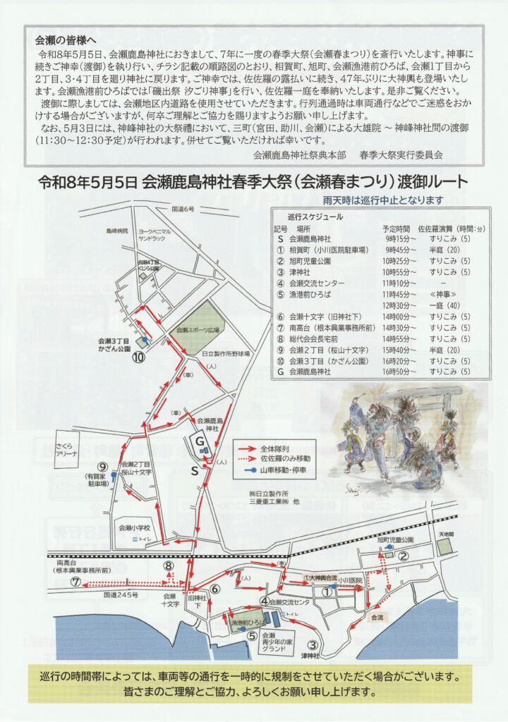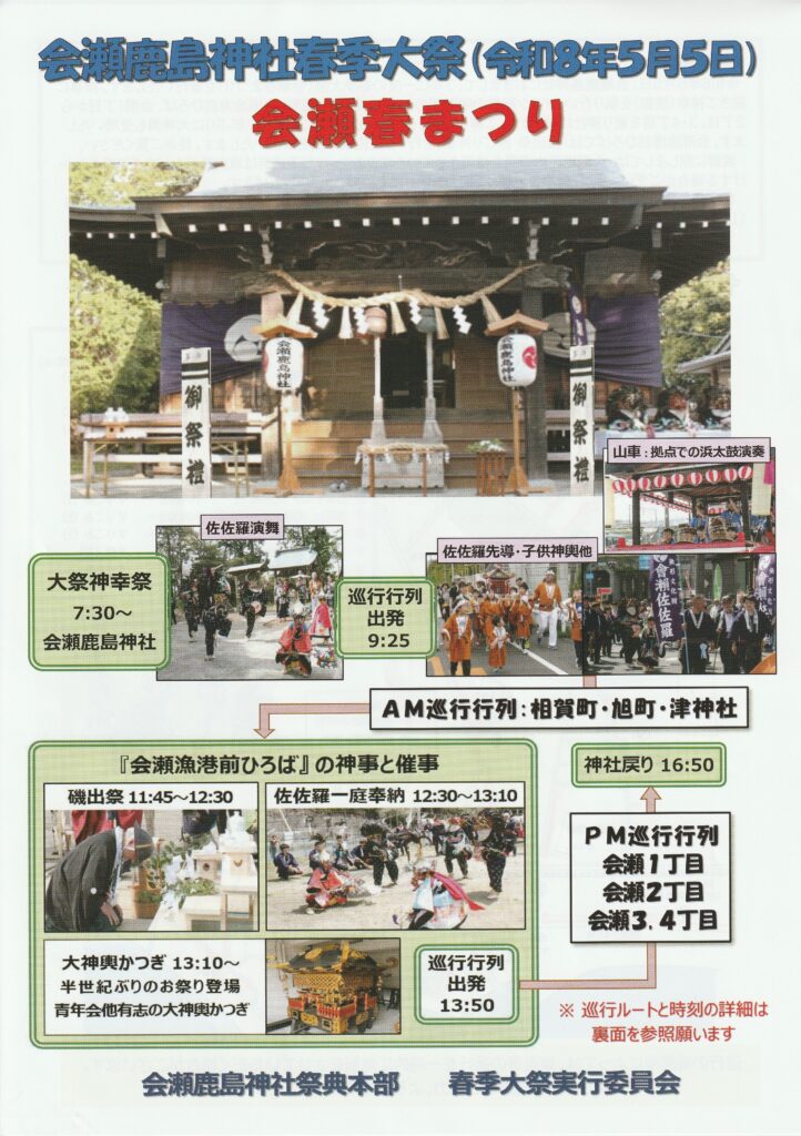 令和8年会瀬鹿島神社春季大祭 2026.03.07 令和8年5月5日、会瀬鹿島神社において7年に一度の春季大祭(会瀬春まつり)を斎行いたします。 皆様のご協力をお願いいたします。 詳細はチラシを参照してください。